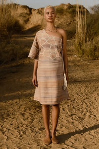 The Gazelle Dress draws inspiration from the African landscape. Patterns found on giraffes have been delicately embroidered on the top, while tassels adorn the dress on the side.