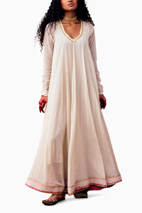 This voluminous off-white maxi dress, crafted from breathable cotton mul fabric, features bijiya gota detailing at the neckline, hemline, and cuffs. A vibrant bright pink contrast at the hemline adds a striking touch. The dress is fully lined for comfort and has a flattering V neckline, combining effortless elegance with modern style.