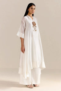 The Genda Kurta is crafted in the most beautiful handwoven organza silk created by our artisans in Bengal. The quinessential Genda exquisitely decorates the kurta. The Kurta is paired with wide pants