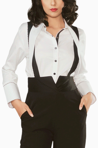 Featuring George White Shirt by Chillosophy from Lovefool Collection. This captivating shirt adorns exaggerated collars that highlight the neckline, with delicate black lace decorating the seams for a charming contrast against the refined fabric. Long sleeves with cuffs and matte black snap buttons ensure a seamless dressing experience.