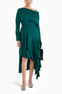 Featuring the Georgia Co-ord Set from House Of Exotique, a fusion of elegance and allure. The top features a chic one-shoulder drop neckline, full sleeves, and shoulder pads, secured with a zipper fastening. Its counterpart, the skirt, boasts a fixed waist and zipper at the side seam, crafting a flattering fit and flare silhouette with ruffle flare detailing. Crafted from satin fabric in a luxurious bottle green hue, this ensemble radiates sophistication and style.