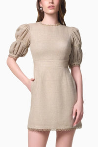 Elevate your wardrobe with this sophisticated dress, featuring clean lines and a timeless design that radiates elegance. The round neckline adorned with crystal embellishments adds a touch of luxury, while the tiered bubble sleeves with delicate gold lace detailing create a refined, feminine silhouette. Built-in chest pads ensure a flattering fit, and the cut-out back with tie-ups and pearl charms adds a stunning detail. Complete with an invisible zip closure and fully lined interior, this dress is perfect for any refined occasion.