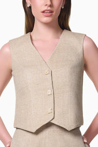 The Georgia Vest is a timeless and chic piece that offers a comfortable fit, effortlessly transitioning from desk to dinner. With a V neckline, structured panelling, and front closure featuring handmade pearl buttons, it exudes elegance. Pair it with the Georgia trouser, skirt, or shorts to complete your polished look.