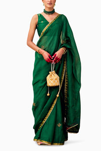 This elegant green Kota Doriya saree, crafted from silk, features intricate embroidery with bijiya gota lace and a vibrant pink contrast detail at the hem. It comes with a classic V-neck embroidered blouse in Chanderi silk, designed with a back tie-up and hook-and-eye fastening.