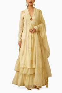 Featuring the Ghee Foil Embroidered Sharara Set by Nikasha from their Kohinoor collection. This elegant ensemble features a ghee foil cotton silk kurta adorned with dabka and sequins zardosi, complemented by a matching handwoven kota doriya double-layer sharara and dupatta.