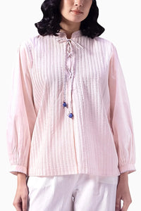 The Gifu Top in soft pink, in cotton voile features pintucks, neemdots, and unique periwinkle blue beetle tassels with red bead eyes hanging from a drawstring adorned with periwinkle blue neemdots