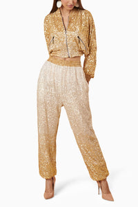 Featuring Gilded Vanilla Ombre Bling Joggers by Siddartha Tytler from Checkmate Collection. Enhance your style with Ivory to Gold ombre georgette joggers, adorned with luxurious gold hand-embroidered sequins. This elegant pair offers a stunning gradient effect and intricate detailing, seamlessly blending comfort and sophistication for a standout look.