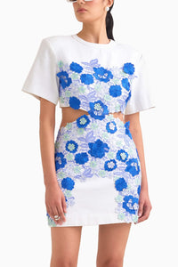 Featuring the Ginni Waist Cut-Out Dress by House Of Exotique. This tailored white short dress, made from twill and lace, boasts a waist cutout, floral lace applique, fitted silhouette, round neck, half sleeves, and back zipper fastening. Perfect for an elegant look.