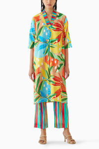 The Gir Kurta & Birch Pants crafted from our 100% cotton fabrication, trans-seasonal, is a statement piece. The kurta, made in our multi floral Gir print, is lined. With a hand embroidered sequin neckline, the piece has a relaxed fit and is part of a two piece set. Featuring a summery look, it is paired with our multi stripe birch stripe pants. Wear it with heels for an elegant look.ÂÂÂ