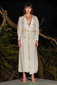 Make a bold statement with our delicate sheer trench-inspired cover-up, a captivating blend of elegance and intrigue. Crafted to exude sophistication, this ethereal garment boasts antique gold buttons that add a touch of timeless charm. The pièce de resistance lies in its unique belt, adorned with antique beads and trims, paired elegantly with wooden beads, creating a mesmerizing fusion of old-world opulence and contemporary flair. Whether layered over your favourite ensemble for a touch of allure or worn as a standalone piece, this cover-up with stylish slits is sure to turn heads and leave a lasting impression wherever you go. Elevate your wardrobe with this exquisite creation, designed to make you feel effortlessly chic and utterly enchanting.