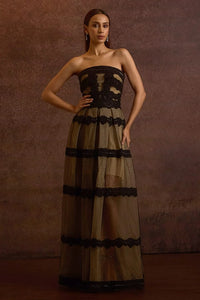 Girisha Black Beige Box Pleat Off Shoulder Gown