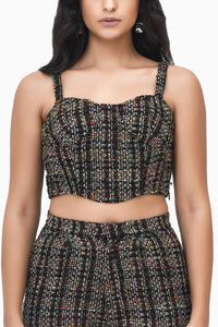 Add a modern twist to your festive wardrobe with this cropped tweed top. Featuring structured straps and a fitted silhouette, its rich, multi-toned pattern brings a bold, textured appeal, making it perfect for both casual and elevated occasions.