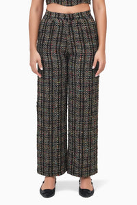 This elegant black tweed trouser is tailored with a flattering mid-rise fit and features a sleek front zip closure. The wide-leg silhouette lends a contemporary, confident appeal, while functional pockets on both sides offer a touch of practicality. Perfect for creating a bold, modern statement.