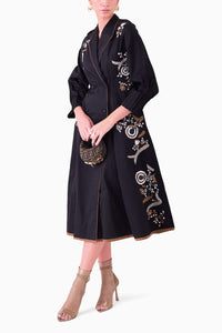 Introducing the Gisela Black Cotton Satin Embroidered Dress—a stunning blend of sophistication and comfort. This 3/4th sleeve dress features exquisite floral embroidery on the sides and a chic double-breasted front, complemented by an elasticated back for a flattering fit. With practical side pockets and a wrap trench design with front buttons, this relaxed-fit dress is perfect for any occasion, adding a touch of elegance to your wardrobe!