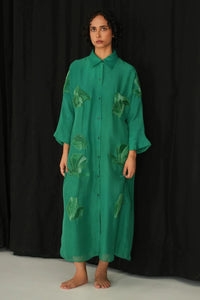 Featuring a shirt dress in jade green viscose organza, this piece is embroidered with forest green ombré PVC cord for a subtle tonal contrast. Designed with a drop shoulder and 3/4 sleeves, it is finished with a front button closure and a midi length for effortless sophistication.