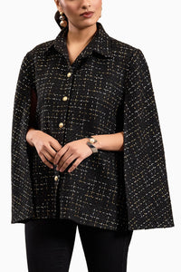 A black tweed cape jacket woven with metallic gold threads for a shimmering plaid effect. Featuring a classic shirt collar, dramatic open sleeves, bold gold-tone buttons, and a flared silhouette, it delivers a luxurious, modern-classic statement with effortless glamour.