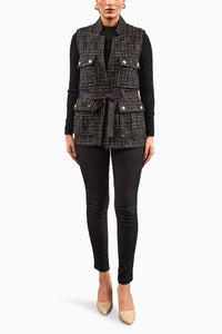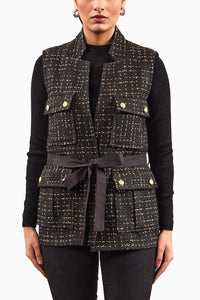 A sleeveless black tweed vest jacket with a structured silhouette, subtle bead embellishments, and four flap pockets. Gold-tone buttons and a detachable belt add refinement, while the open-front design makes it a versatile, sophisticated layer for chic, semi-formal, or office looks.