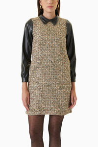 Trendy and Classic exquisite metallic tweed dress with faux leather trims, Pair it with knee high boots for that lounge or your best friends winter brunch.
