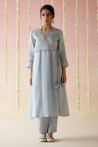 This refined two-piece set includes an Angrakha and Pants, complemented by a coordinating Dupatta. The Angrakha showcases delicate aari work along the edges, offering a touch of elegance. Paired with sleek narrow pants, the ensemble is completed with the matching Dupatta for a perfectly coordinated look.