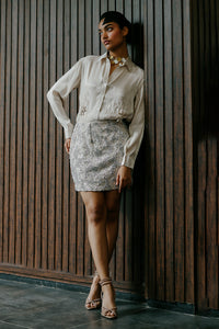 Featuring the Glow Getter Shirt With Skirt Set by Trisara's Fuss Over Me Collection. This beige metallic top with 3D hand embroidery pairs effortlessly with a net skirt adorned with silver sequins, offering a fitted silhouette for a sophisticated and dazzling look.