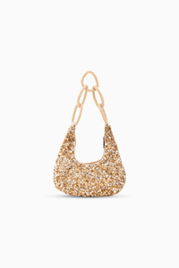 Featuring Gold Abraxas Handbag by 5 Elements by Radhika Gupta. Elevate your style with sophistication and glamour. Adorned with intricate stone sequence embroidery, this chic accessory makes a bold statement. Impeccably crafted with leatherette and a detachable crossbody chain, it's a perfect blend of timeless elegance and contemporary fashion.