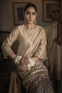 Featuring Gold and Jamun Purple Jind Top by Swatti Kapoor from their Faridkoot Collection. This exquisite top is crafted in handwoven Chanderi fabric with intricate handblock printing in gold foil and vibrant colors. It is elegantly ornamented with detailed hand-embroidered beadwork, adding a touch of refined craftsmanship and sophistication.
