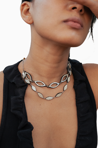 Catch some serious style points with this eyelet choker. It's crafted from patchy silver leather, with an edgy black finish and a shiny silver chain. Stand out from the crowd without even trying.