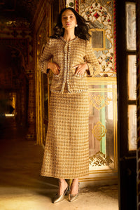 Luxurious textured gold boucle jacket with a hand-twisted pearl-accented gold chain along the edges. Features pockets and a hook-and-eye closure in the front. Garment is fully lined. Paired with a matching straight midi skirt in gold with a side slit and side zip closure. Maxi length. Garment is fully lined.