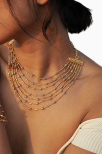 Add a touch of sparkle to your outfit with this gorgeous Cascade Choker. Featuring a delicate gold-plated brass chain with silver leather-wrapped elements, this layered neckpiece is the perfect finishing touch for any special occasion. Style with your favorite dress and let the compliments roll in!