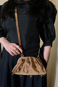 She isn’t limited by definitions, and challenges them with great ease and aplomb. Never ceases to find more gold within herself and feeling like her greatest self, and does so like a breeze. She’s - Gold Digger. Inherent with faun gold silk velvet, and tassels complete with metallic gold and tonal crystal beads all around - she’s an effortless and statement outfit companion to any look. The gold tassels and undulating texture from the pleating of the fabric add the signature Aomidori Shimai glimmer, and character. It comes with a tonal velvet strap that doesn’t dig into the skin, and its lined interior fits every essential you need, for you to be & feel golden.