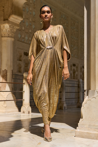 Draped V-neck kaftan in a shimmering drapey gold knit fabric. Hand sewn pleats in the front add a flattering shape. Held together with a sewn on hammered gold metallic piece in the front. Maxi length.