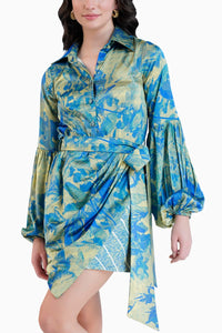 Featuring the Gold Foil Botanical Foliage Printed Short Dress with Belt by Mandira Wirk's Waves of Love Collection. This elegant blue satin dress features a stunning gold foil botanical print, buttons down the center front, stylish puff sleeves, and a flattering belt, making it perfect for any chic occasion.