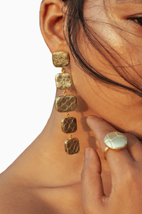 Make a bold statement with these gold plated brass box danglers. Crafted from luxurious croco leather in a stunning gold hue with dazzling green undertones, these statement earrings are sure to be the highlight of any look!