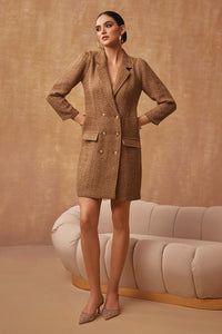 Featuring Gold Metallic Tweed Blazer Dress by Bohochic's Lumiere Collection. Crafted in metallic tweed, this blazer dress delivers a sharp, structured silhouette with luminous gold tones, perfect for statement-making evenings and power dressing.