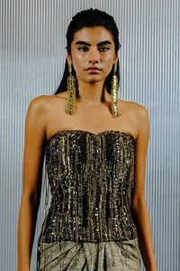 Featuring Gold Multi Shape Sequins Corset by CITARA’s Bridesmaid Collection. Crafted in royal georgette with satin lining, this fitted corset gleams with multi-shape sequins and delicate chain accents, perfect for a bold, sculpted look.