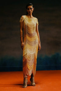 Featuring The Gold Ombre Net Tassel Dress from Citara's collection showcases gold ombre tassels draped artfully to command attention. Style with minimal jewelry and open-toe heels for standout moments.