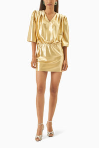 Sleek meets stylish in this dress, crafted with a liquid metallic fabric. The big sleeves, deep neckline and elastic at the waist gives it a flattering look for the perfect night out.