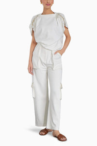 Off white track set featuring a top and utility-forward bottoms. complete with gold ruffle detailing.