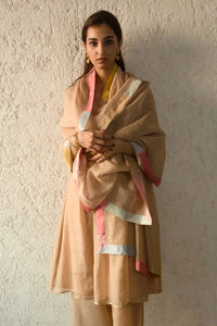 The Gold Sand Sheer Sparkle Odhani is a radiant shimmer silk scarf, featuring delicate gold and silver sparkles and beautifully patched silk borders. This elegant odhani adds a luxurious touch of glamour and refinement to any outfit.