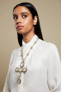 The Gold & Silver Polki Cross Necklace combines spiritual symbolism with refined craftsmanship. Made from copper and brass with a 22k gold or white rhodium finish, it features a beautifully detailed cross adorned with radiant Polki stones, perfect for adding grace and meaning to any outfit.