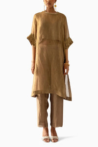 Discover elegance and sophistication with our Gold Straight Suit. Made from organza tissue, this kurta features delicate embroidery on the sleeves, bustier, and pants.