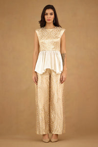 SHA Gold White Laser Cut Co-ord Set by Shasha Gaba from the Pret collection features a chic Indowestern design in shimmering gold, crafted with luxurious chanderi and gold cotton lurex. Regular fit ensures effortless elegance for festive or casual occasions.