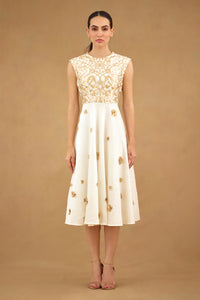 SHA Gold and White Laser Cut Dress by Shasha Gaba from the Pret collection showcases a graceful Indowestern silhouette in gold and white. Crafted from luxurious chanderi and gold cotton lurex with intricate laser-cut detailing, its regular fit ensures elegant, festive style.