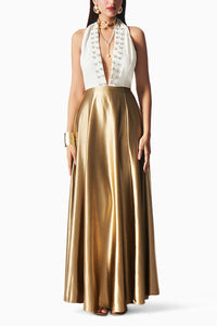 This beautiful dress features a V-neck halter white top paired with an attached dusty golden long panel skirt, creating a striking and elegant silhouette. The top is adorned with petal-shaped stones, adding a touch of glamour and sophistication. Perfect for formal events or special occasions, this dress combines modern style with a timeless allure.