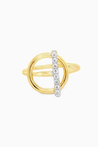 The Golden Axis Ring showcases a striking balance between modern geometry and classic sparkle. With a vertical line of moissanites cutting through a bold circular design, this vermeil gold ring offers a fresh, architectural appeal. Perfect for adding a touch of contemporary elegance to your everyday style.