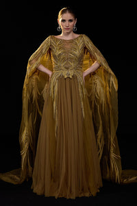 Exquisite golden-bronze gown featuring intricate embroidery and majestic flowing cape sleeves. A truly elegant statement piece in cotton silk and organza silk