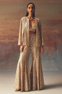 Featuring a golden cape-sleeve jacket, this statement piece offers a flowing, comfortable fit with a touch of drama. Paired with a golden georgette bralette and bootcut pants, adorned with mirrorwork and delicate beadwork, this ensemble is perfect for making a striking impression at any celebration.