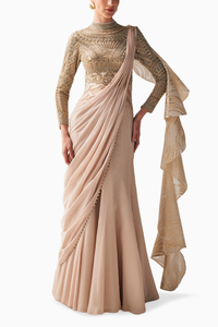 Featuring Golden Cream Opulent Gilded Draped Saree Set by Mandira Wirk. Step into elegance with this stunning golden cream saree crafted from luxurious shimmer chiffon. Paired with a fancy blouse adorned with intricate zardozi work and an elaborate high neckline, it's perfect for special occasions where you want to exude style and grace.