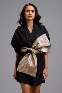 Featuring the Golden Eclipse Tailored Playsuit by Deepika Arora's Eclipse Collection. Crafted with a wide notched lapel collar, this chic playsuit is cinched at the waist with an oversized gold bow, blending tailored finesse with radiant allure.