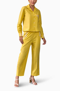 Elevate your date night ensemble with this charming yellow cotton co-ord set. The collared shirt features a stylish front opening and full sleeves, while the wide-leg embroidered pants add a touch of sophistication. Perfect for a romantic evening out, this outfit effortlessly combines comfort and style for a memorable look.